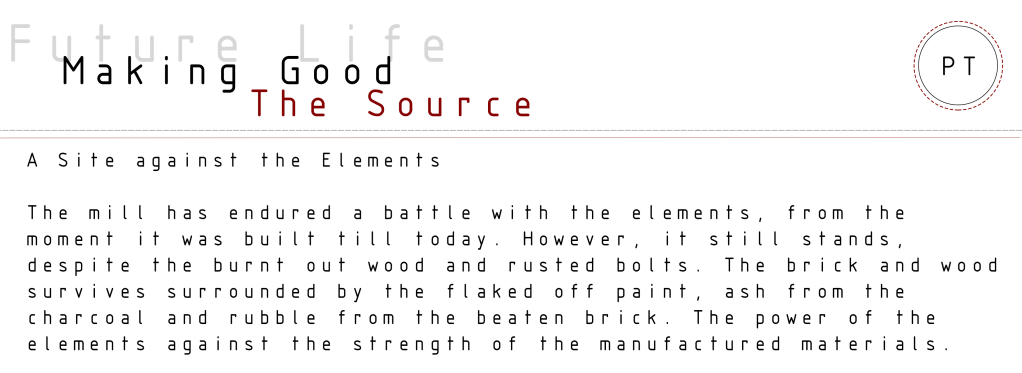 First hand in of 3rd year was for my Future Life module. We visited Hanover Street Mill and took pictures and objects of the site. It is a mill that hasn’t been used for many years and endured a fire so has many signs of decay and dereliction. I had to pick up an object and eventually draw the object or part of the site at A2 size. From the object and the site I then had to create an essence model based on my interpretation of the site and what I took from it.