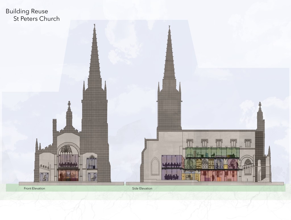 The final project of second year was the project with the most work involved and is my best work to date, I think. The site for this project was St Peters Church which is on campus and is currently used for performing arts students. The brief was to redesign the church into a library/study zone with a gallery space and meeting rooms for design students. I decided to focus on parts of the church’s design that could potentially incorporate into my final design as I wanted it to match the church and not look too modern inside. Th stained glass windows is what I thought could be used well in my design but I didn’t want something too distracting as this was a study pace. I used just block colours that were the same found in the windows and placed these coloured glass paned within a black steel frame to mimic the lead outlining. I created different zones and pods with the main ground floor level space being a gallery area as it will have the most traffic. I included big meeting rooms and smaller work rooms big enough for one person so I could utilise as much of the space as possible and cater for all. I focused mainly on the photoshop part of the presentation as we had to use an A1 board for our final design. I put my design on to CAD first then I exported it to Photoshop to add the colour, people and the key to show the different areas. I was so proud of this project and think it turned out really good considering I also went to Singapore with uni during this project. I just wish I had done a final model for this project but I wanted my board to show the design well enough to not need one and I think I achieved that.